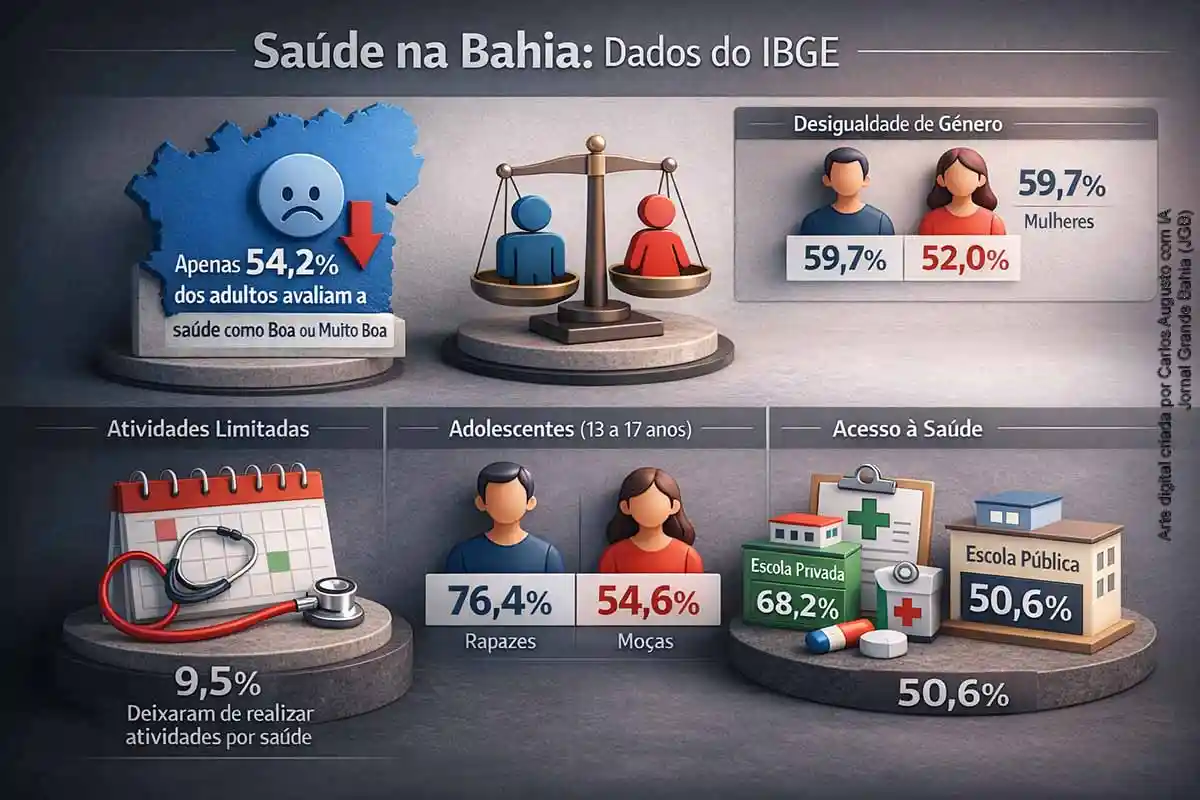 No Dia Mundial da Saúde de 2026, comemorado em 7 de abril, dados recentes do Instituto Brasileiro de Geografia e Estatística (IBGE) revelaram que a Bahia está entre os estados com as piores autoavaliações de saúde no Brasil. As informações, coletadas na Pesquisa Nacional de Saúde (PNS) de 2019 e na Pesquisa Nacional de Saúde do Escolar (PeNSE) de 2024, destacam não apenas a percepção individual da saúde, mas também as significativas disparidades de gênero e o acesso aos serviços médicos.